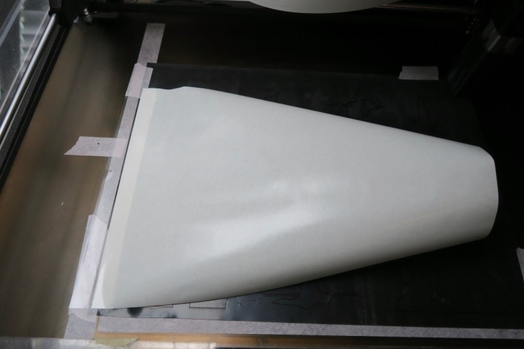 To avoid this issue, after cutting apply a sheet of low tack film. Remove the backing from the first 20mm of film and stick to this the bed of the laser cutter, and then smoothly, with a soft roller (10cm gloss paint roller), apply the film. This is a delicate procedure and you only get one chance to get it right.