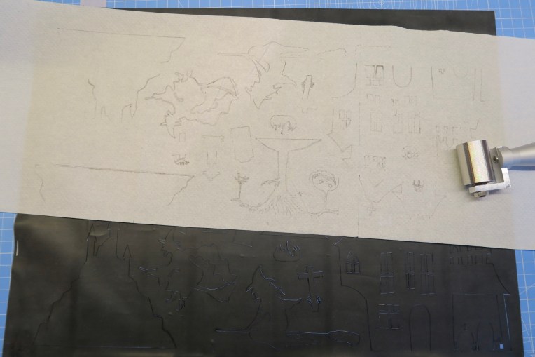 With the film applied use a hard roller to ensure that it is firmly adhered to the latex. Carefully peel the combined film and latex from the laser cutter.