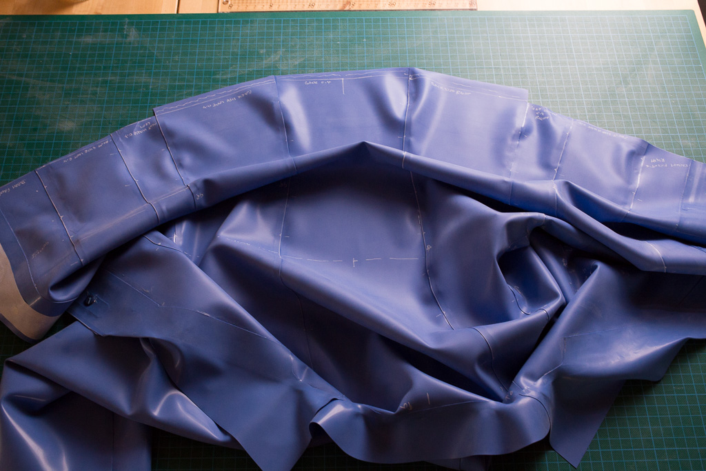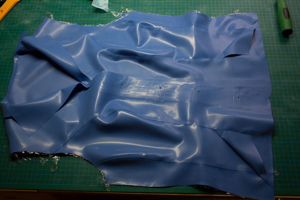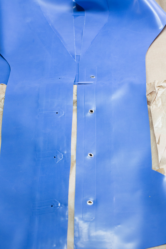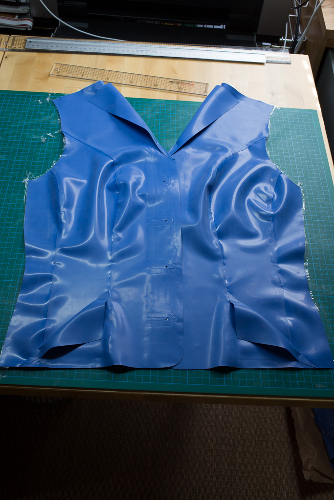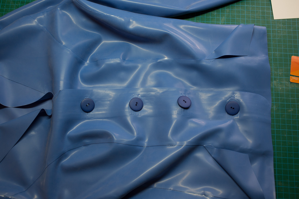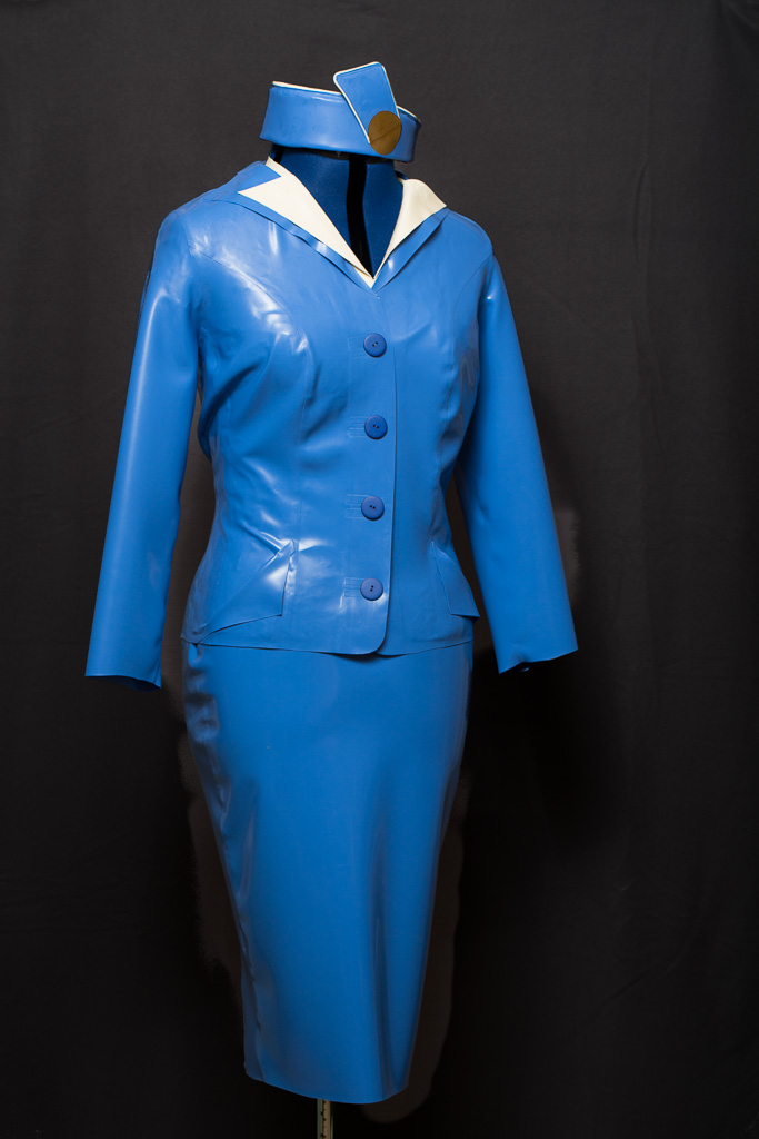 This is the tutorial for making the jacket for the PanAm inspired latex stewardess outfit.   The jacket is unusual in that it uses real buttons – seldom seen on latex clothing (due I think to the point stresses involved – issues that hopefully I’ve solved here).