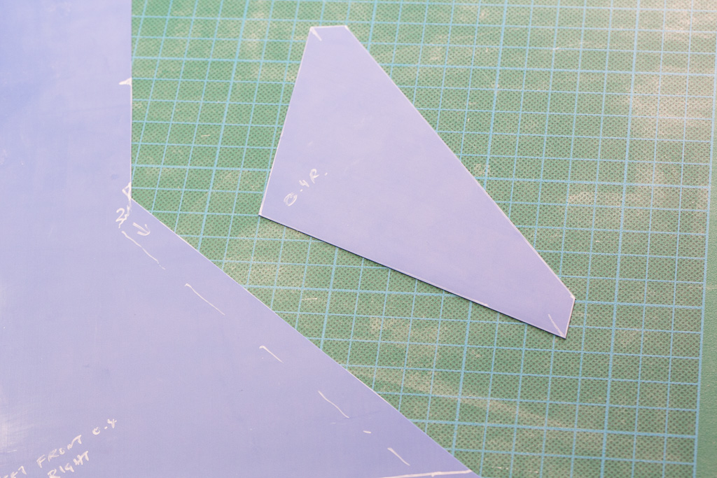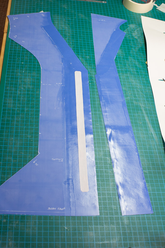 The jacket front is constructed from three pieces in order to have a straight edge for the main front seam.