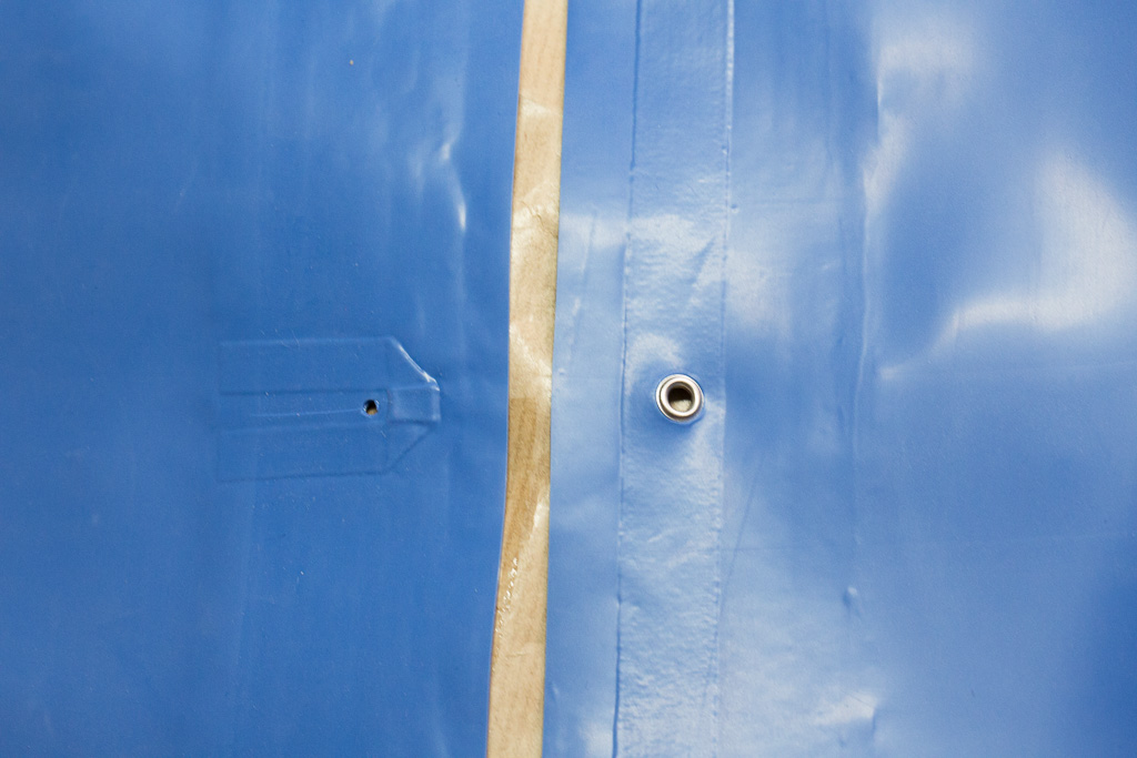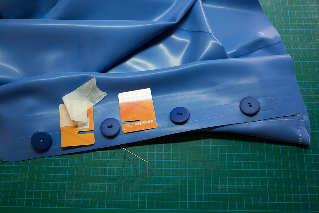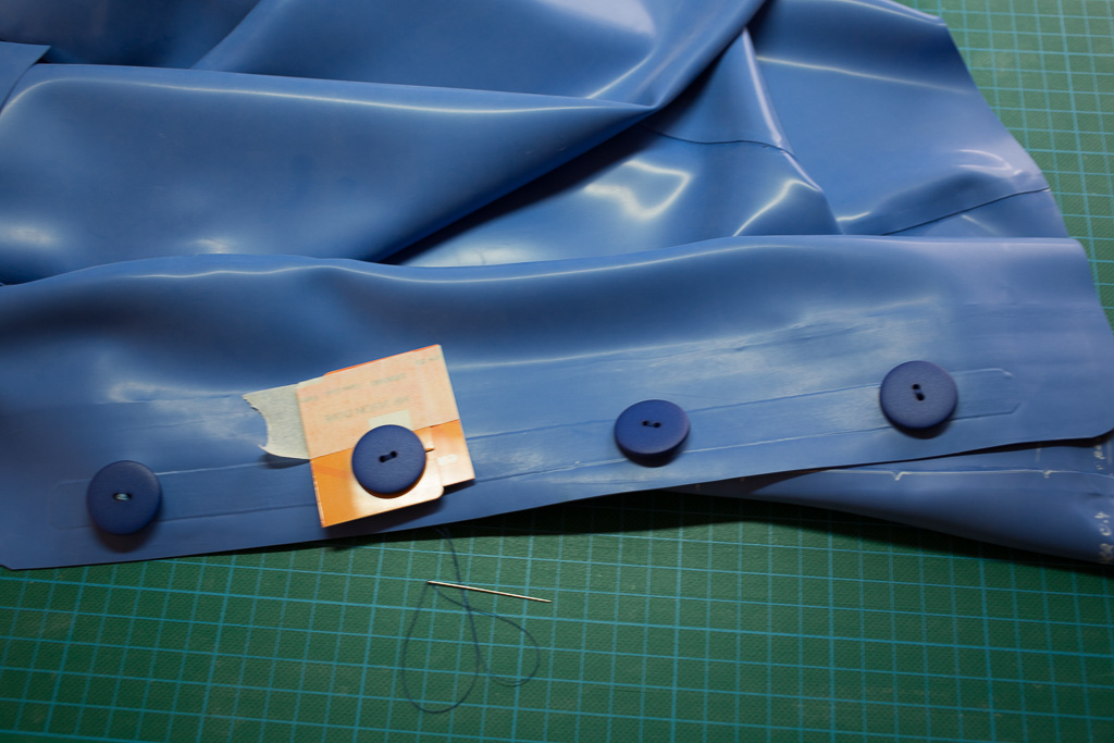 Rather than sew the button directly to the latex – introducing more points of focussed stress – we have used an eyelet and cotton tape re-enforcement as we would have done if we were using poppers.  The button is attached by sewing a small button on the inside to the large button not the outside – we are not sewing into the latex.