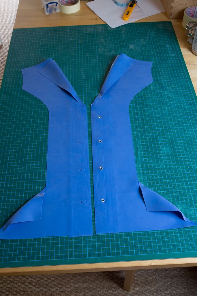 The front pieces are formed from two pieces of latex laminated together.  The left and right side are constructed different to allow for the button holes and buttons.