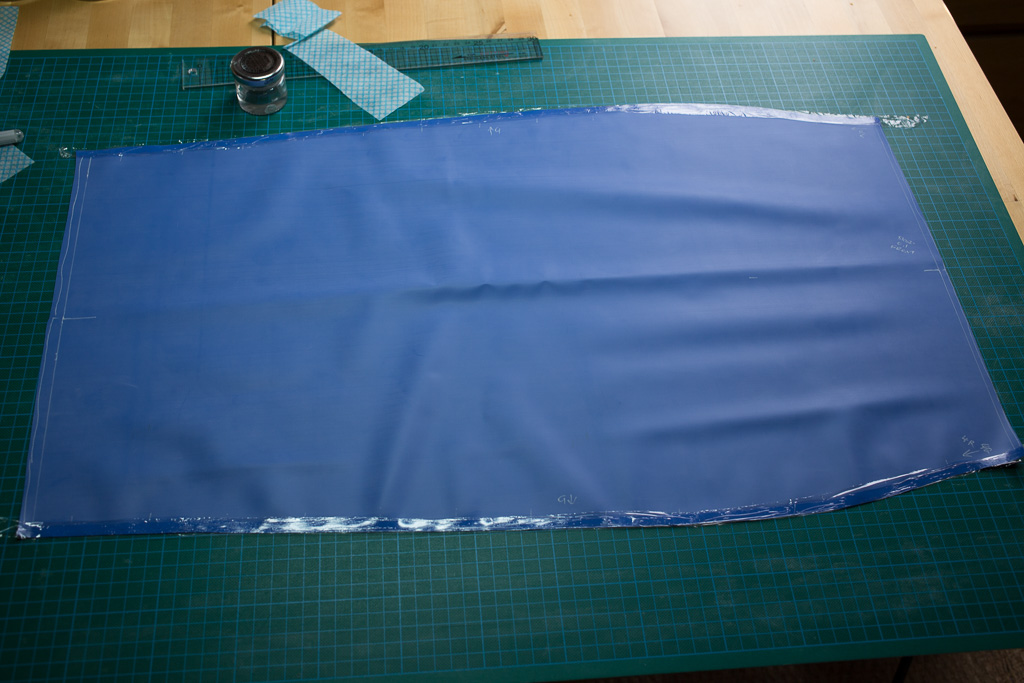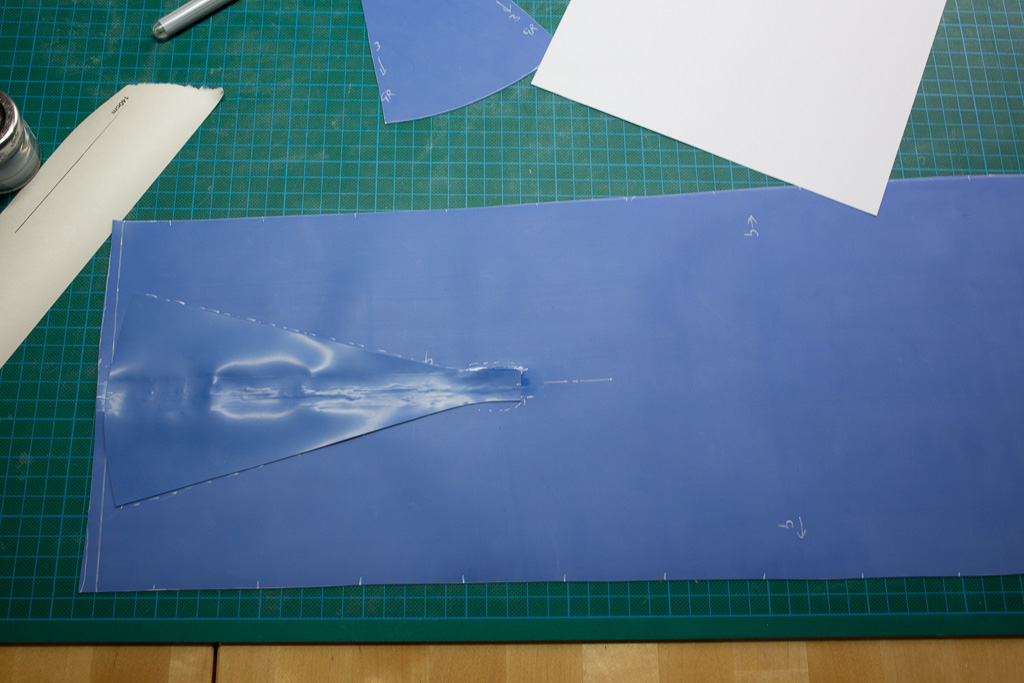 The first piece is glued to the centre of the back panel, matt-to-matt and using a strip of glue twice as wide as normal.